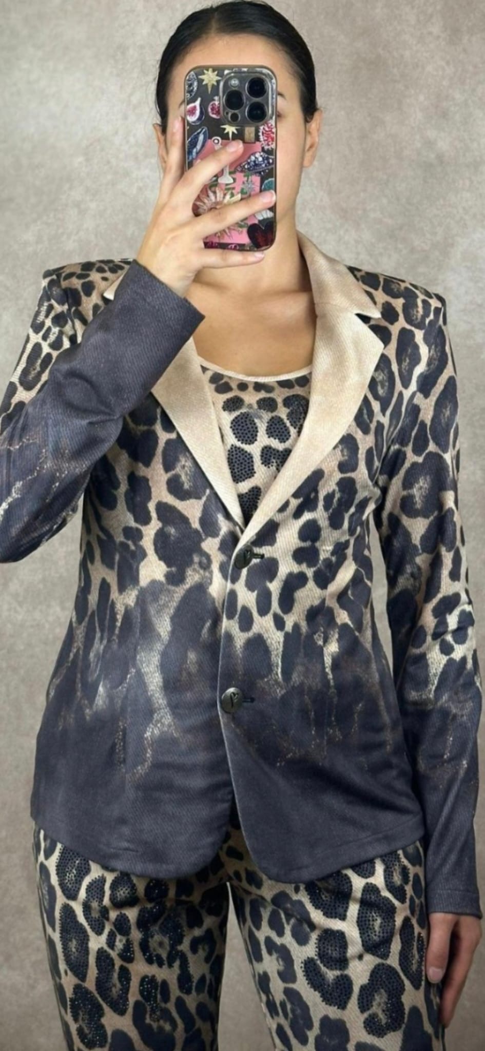 – **Detalles Únicos**: La parte trasera del blazer cuenta con grillitos en negro que complementan las manchas del estampado, aportando un detalle visual atractivo y único que asegura que te destaques en cualquier lugar.